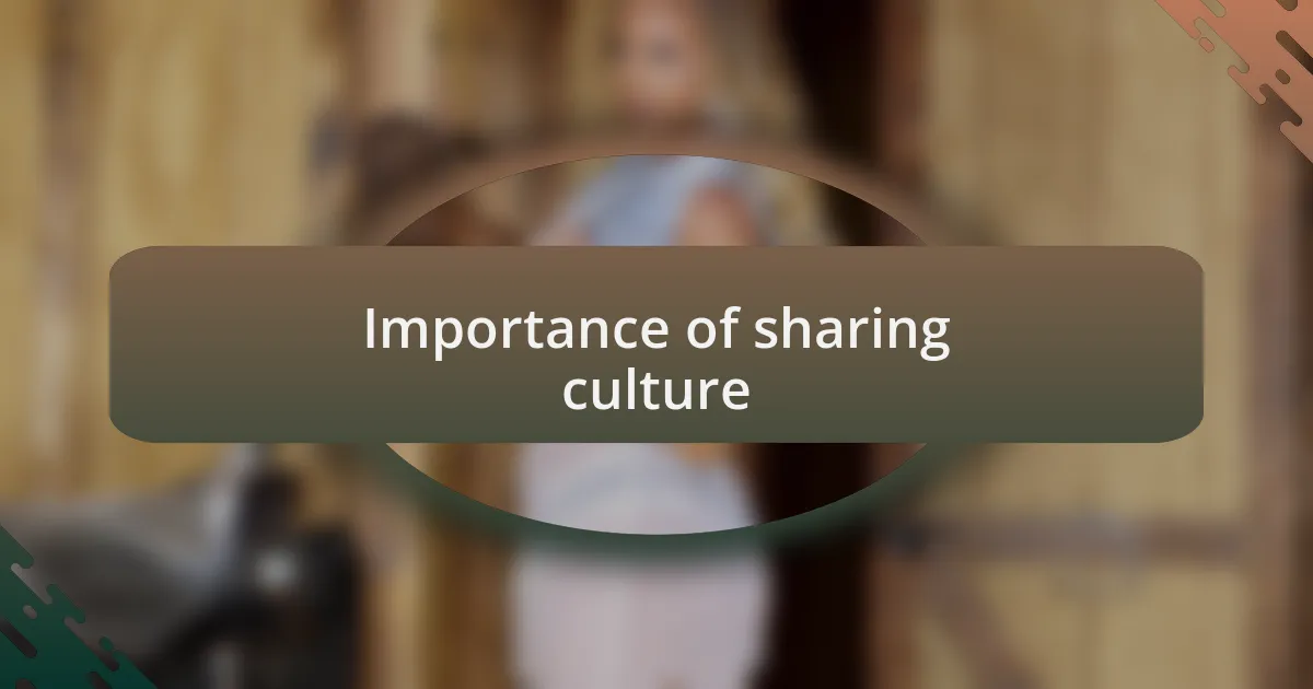 Sharing culture is vital because it enriches our understanding of one another. I once participated in a storytelling session with kids from diverse backgrounds, and I was fascinated to hear about their traditions and customs. It reminded me just how much we can learn from each other’s experiences and the values that shape our lives.